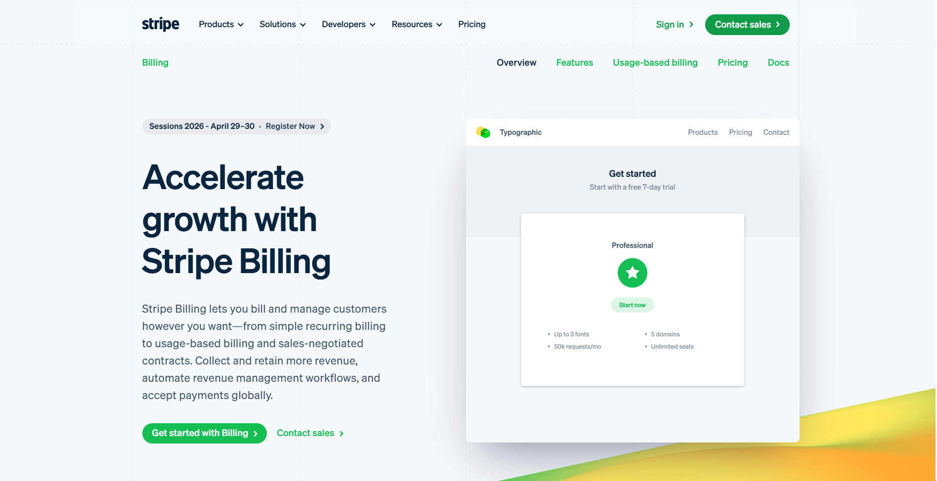 - What it does: Stripe Billing manages subscription billing, recurring invoices, and usage-based pricing models. It automates payment collection and handles complex billing scenarios like proration and upgrades.