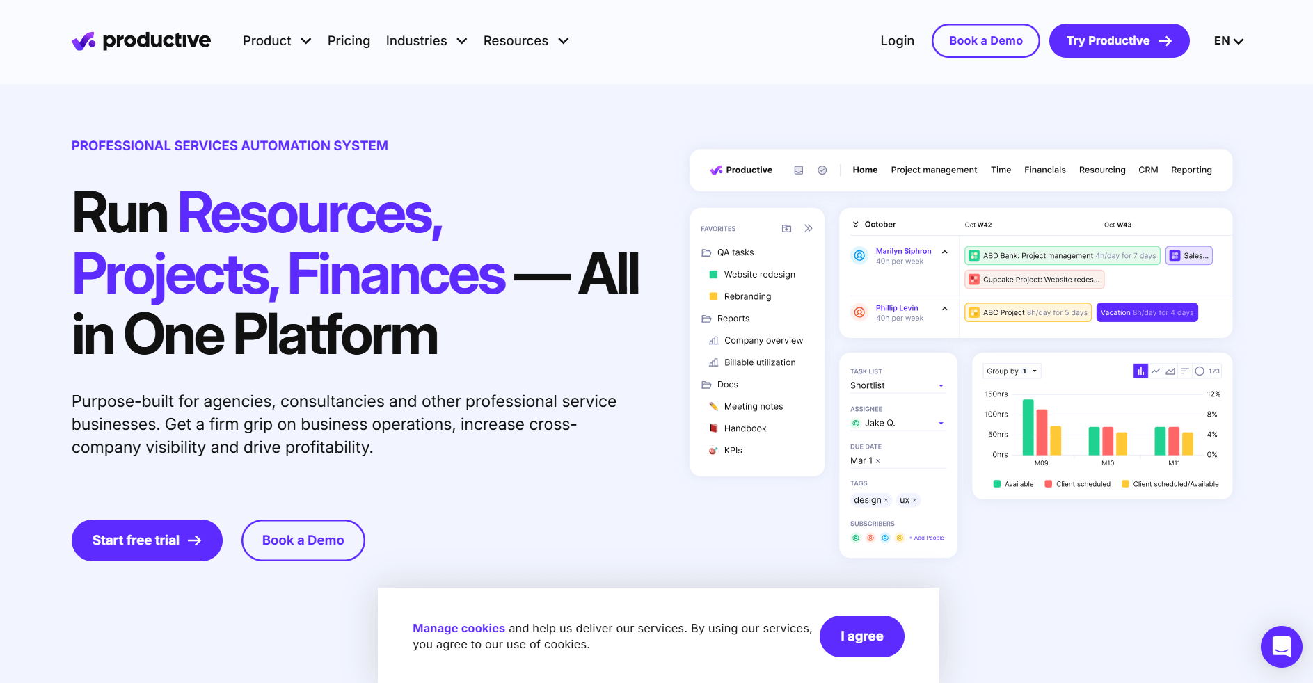 - What it does: Productive is an agency management platform with project management, time tracking, budgeting, and invoicing. It tracks profitability in real time by connecting tracked hours to project budgets and expenses.