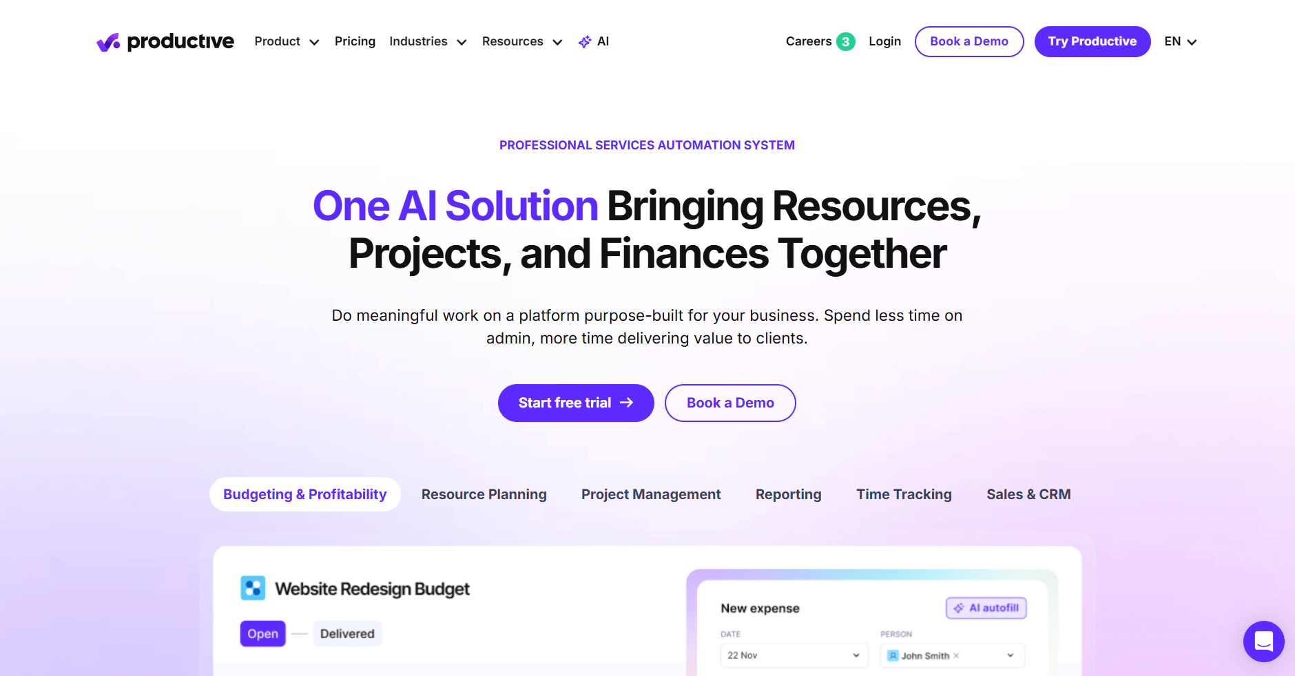 - What it does: Productive is an agency management software tool that tracks project budgets, margins, and team utilization. It connects time tracking to financial reporting so you can see which clients and projects are profitable. The platform handles resource planning, invoicing, and forecasting in one system.