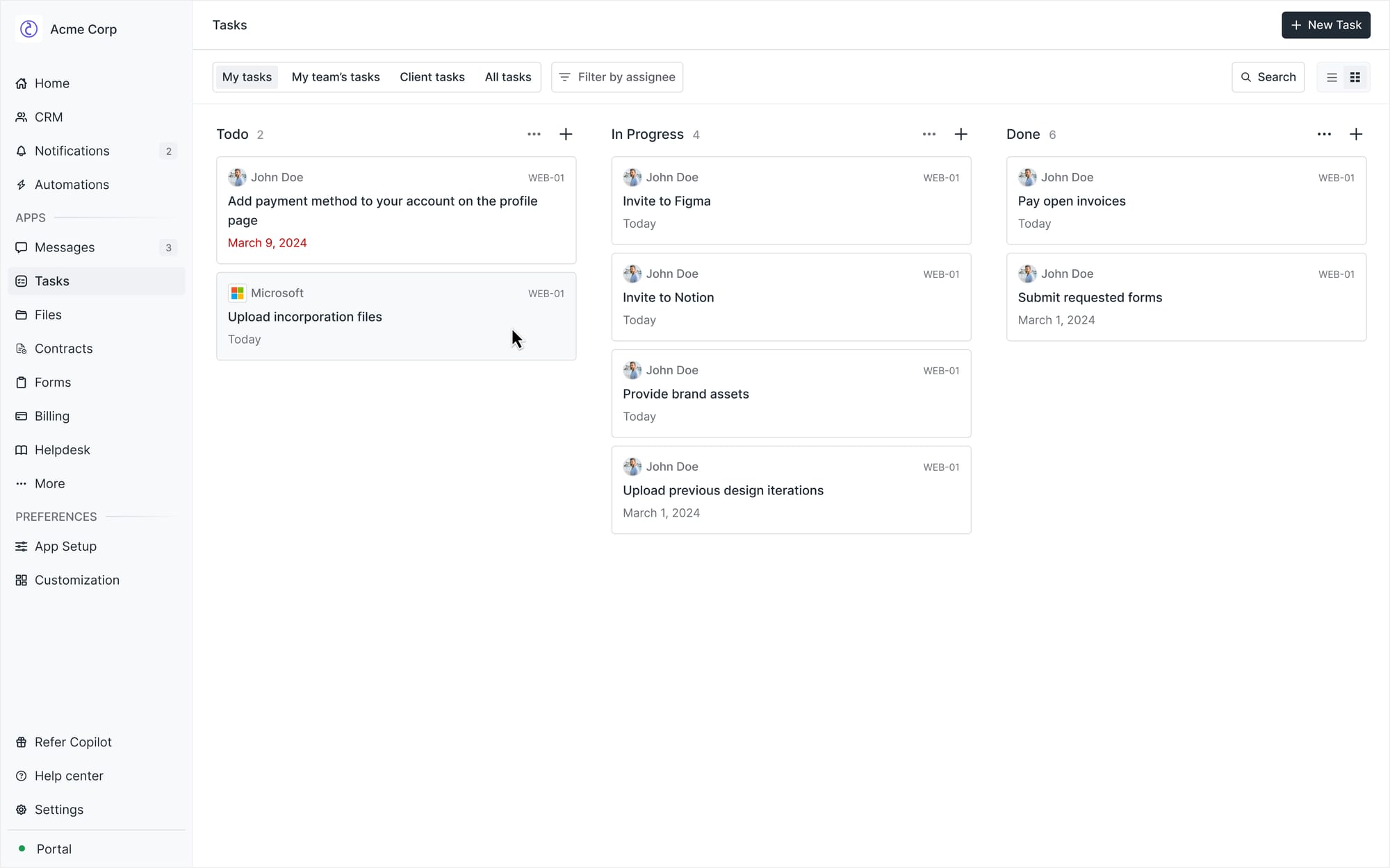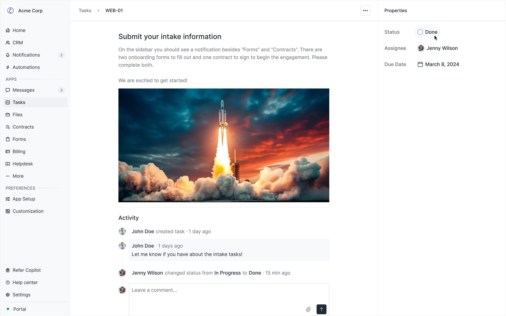 With existing apps, you can notify clients about open invoices, contracts that need to be signed, and much more. But what if you’re working on a project with a client and you need the client to perform specific one-off tasks — such as inviting you as a user to a product, uploading specific files, or approving certain documents? Now you can use the Tasks App to create tasks of this nature and assign them to clients who are notified via email and in-product. Clients can then leave comments if they have additional questions and mark the task done once complete.
