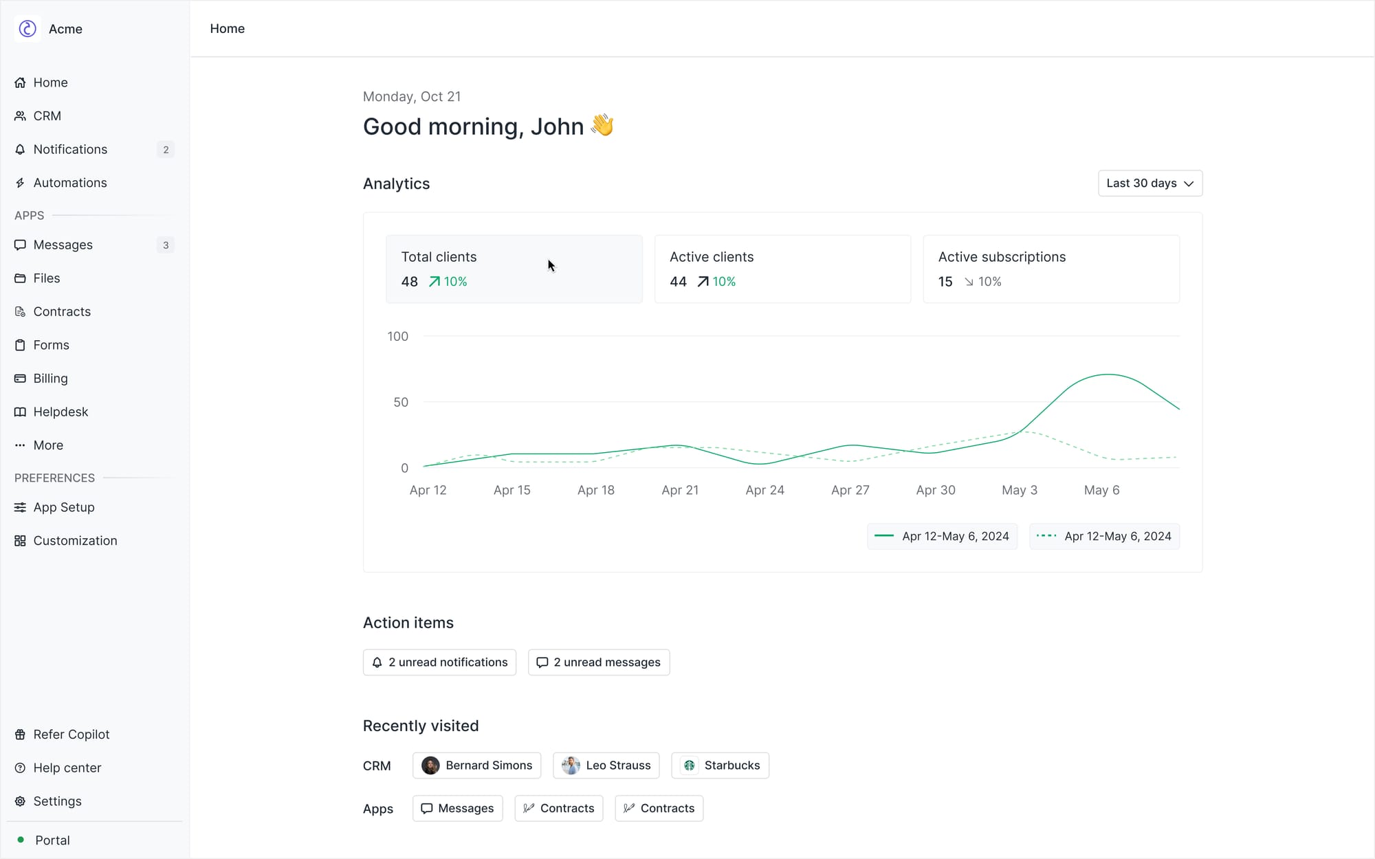The new homepage features an analytics section at the top that displays your total clients, active clients, and active subscriptions (if the Billing App is enabled). Below the analytics, you'll find sections showing unread notifications and recently visited pages for easier navigation.
