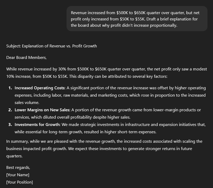 You can use an example prompt like: "Revenue increased from $500K to $650K quarter over quarter, but net profit only increased from $50K to $55K. Draft a brief explanation for the board about why profit didn't increase proportionally."