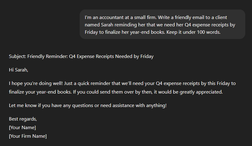 You can use ChatGPT to draft the type of client emails you write repeatedly, like tax deadline reminders, document request follow-ups, and status updates on returns in progress.