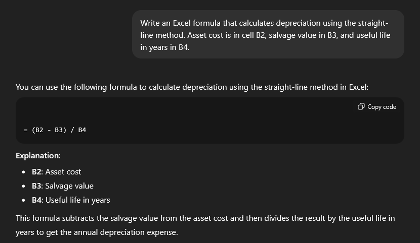 You can use an example prompt like: "Write an Excel formula that calculates depreciation using the straight-line method. Asset cost is in cell B2, salvage value in B3, and useful life in years in B4."
