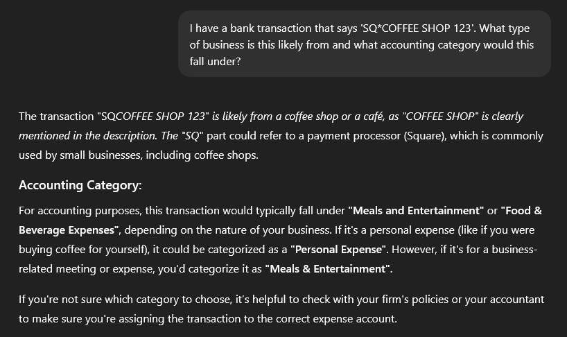 It’s important to remember that ChatGPT makes educated guesses. You still need to verify the merchant and confirm the category fits your client's business. I wouldn’t rely on it for final categorization without double-checking.
