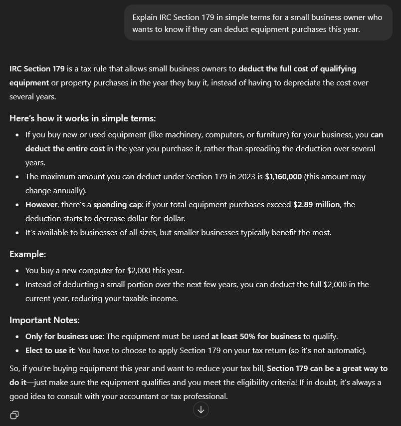 Check out how ChatGPT breaks down IRC Section 179 in plain English: