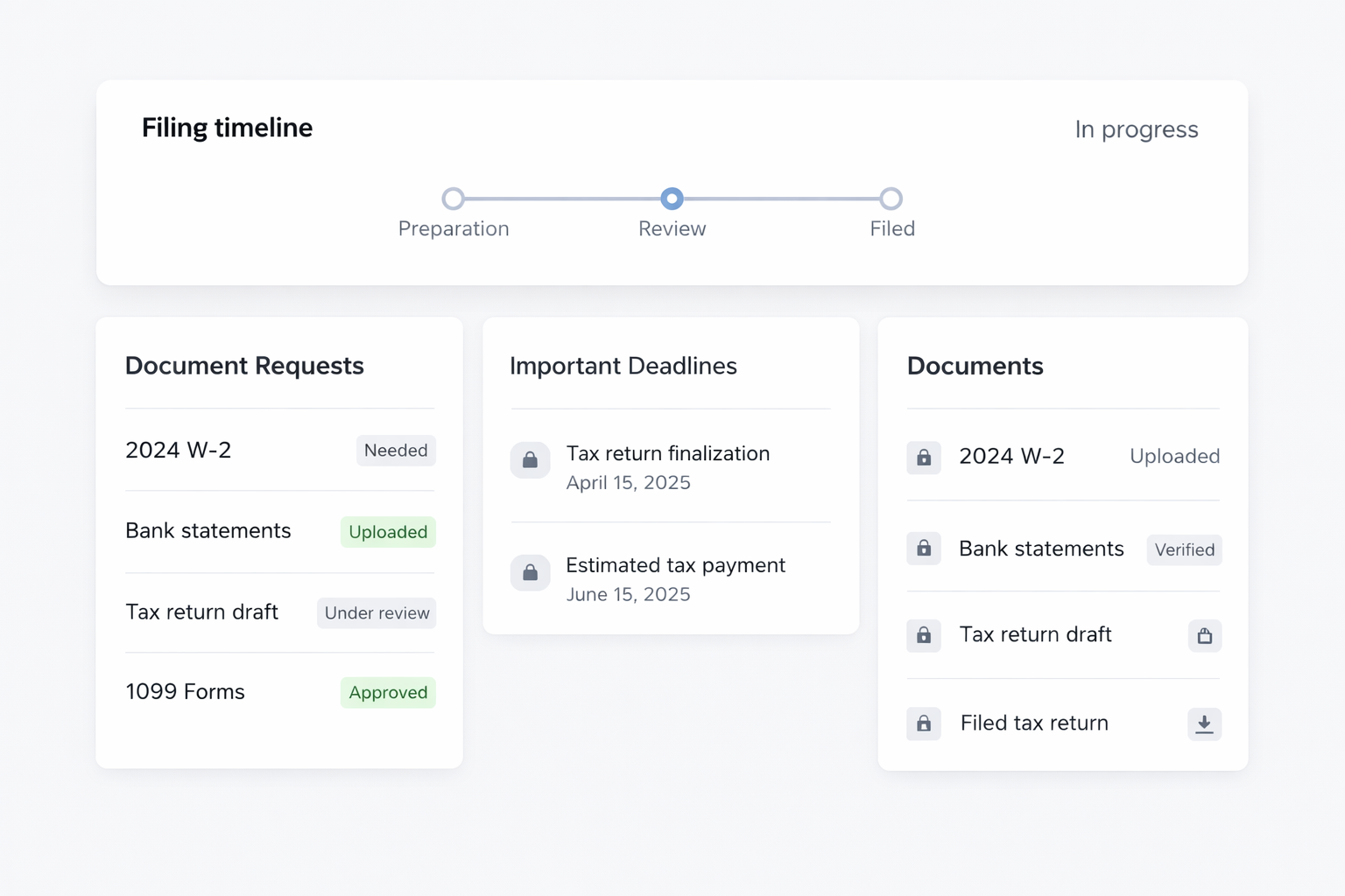 Accounting firm portals typically include secure file upload for sensitive documents like W-2s or bank statements. Clients can check the status of their tax return, see what information the firm still needs, and receive notifications when documents are ready to review.