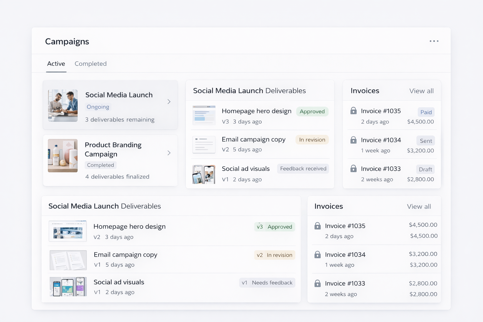 Marketing and creative agencies use client portals to share campaign assets, collect feedback, manage revisions, and invoice for completed work. These dashboards organize deliverables by project or campaign so clients can easily find what they need.