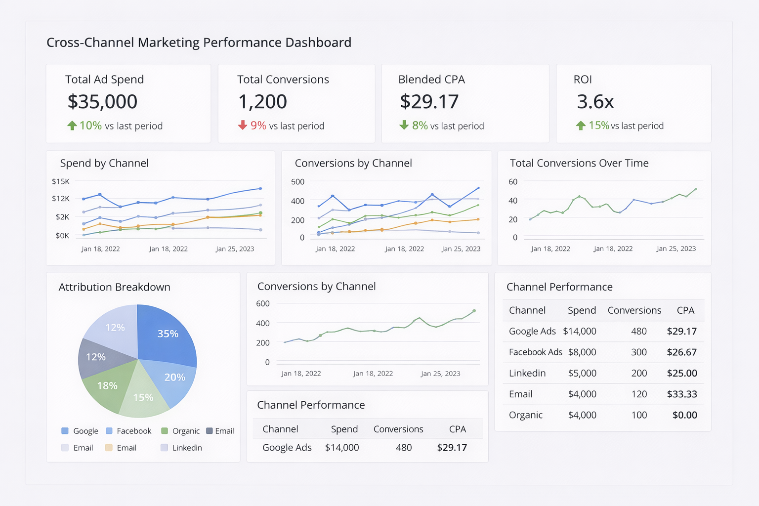 This dashboard shows total spending across channels. It also tracks conversions by source, cost per acquisition, and overall ROI. For example, when you see e-mail costs $33.33 per lead while Facebook Ads cost $26.67, you know where to invest more.