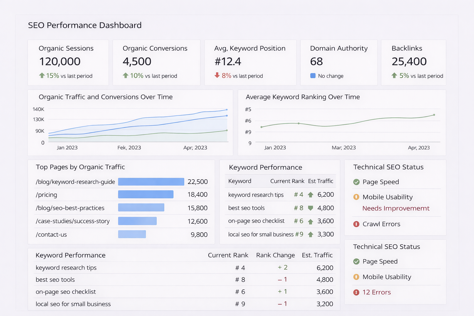 You'll see which keywords bring traffic and how rankings change month over month. You'll also see which pages perform best. SEO dashboards can also track technical issues like page speed, mobile usability, and crawl errors when connected to platforms like Google Search Console.