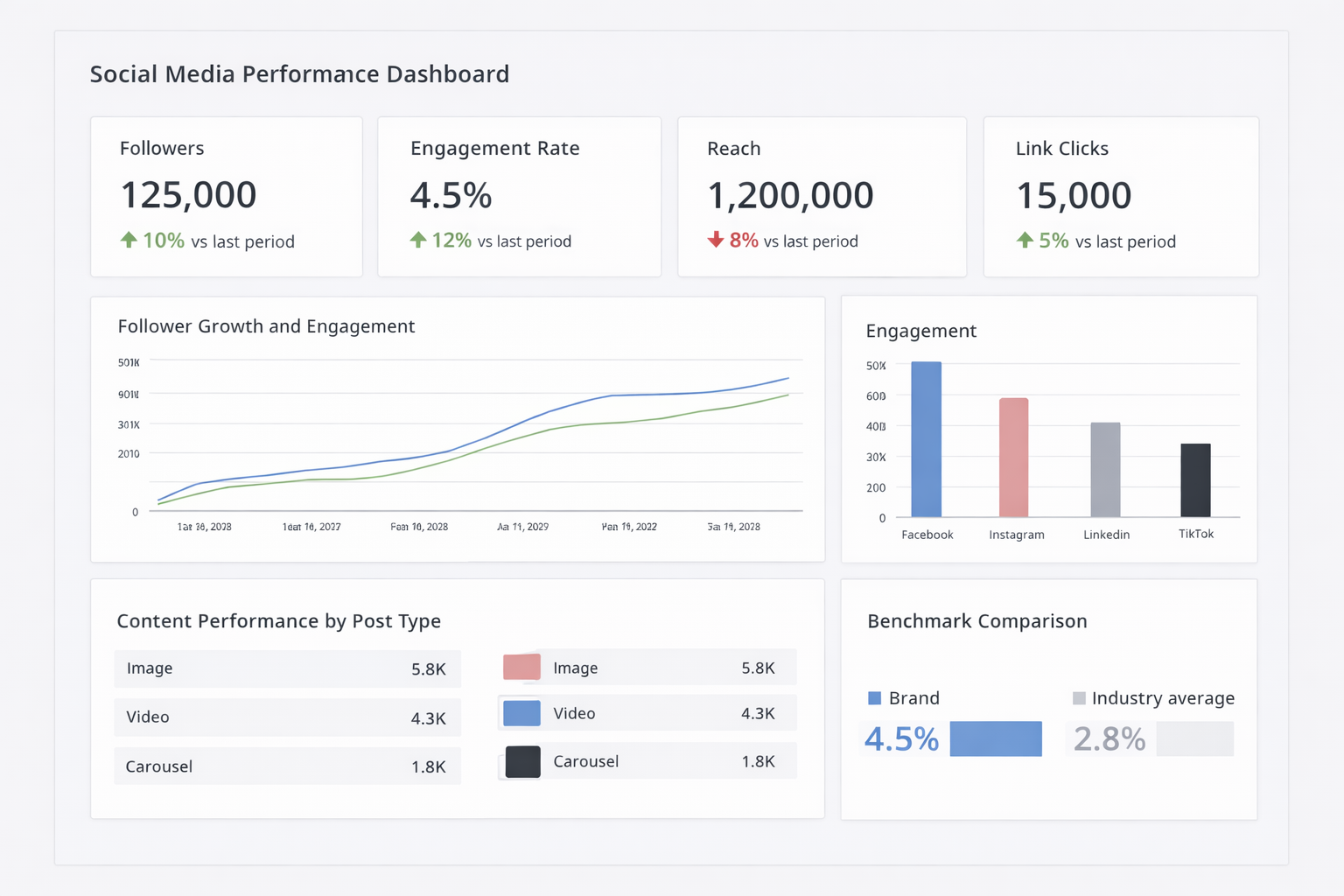 Social media dashboards track performance across platforms like Facebook, Instagram, LinkedIn, and TikTok. You'll see follower growth, engagement rates, post reach, and click-through rates in one place.