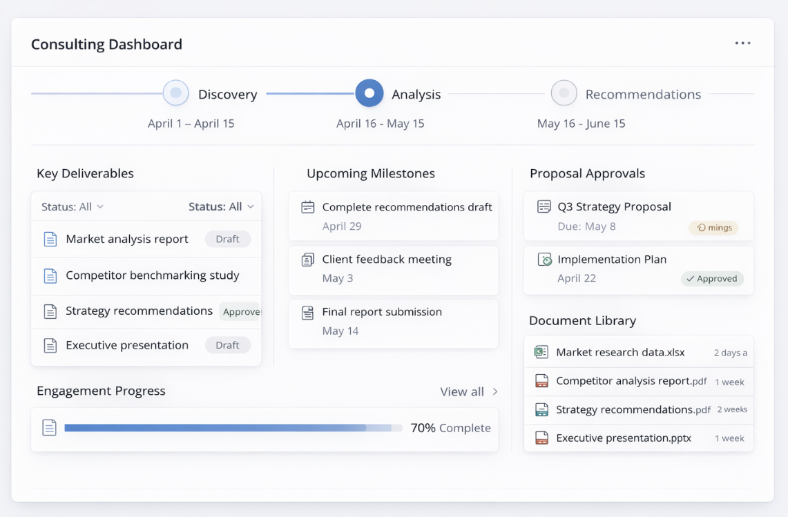 Consulting firms need dashboards that handle long-term engagements with multiple deliverables. These dashboards organize projects by phase, track deliverable status, share research documents, and manage proposal approvals.