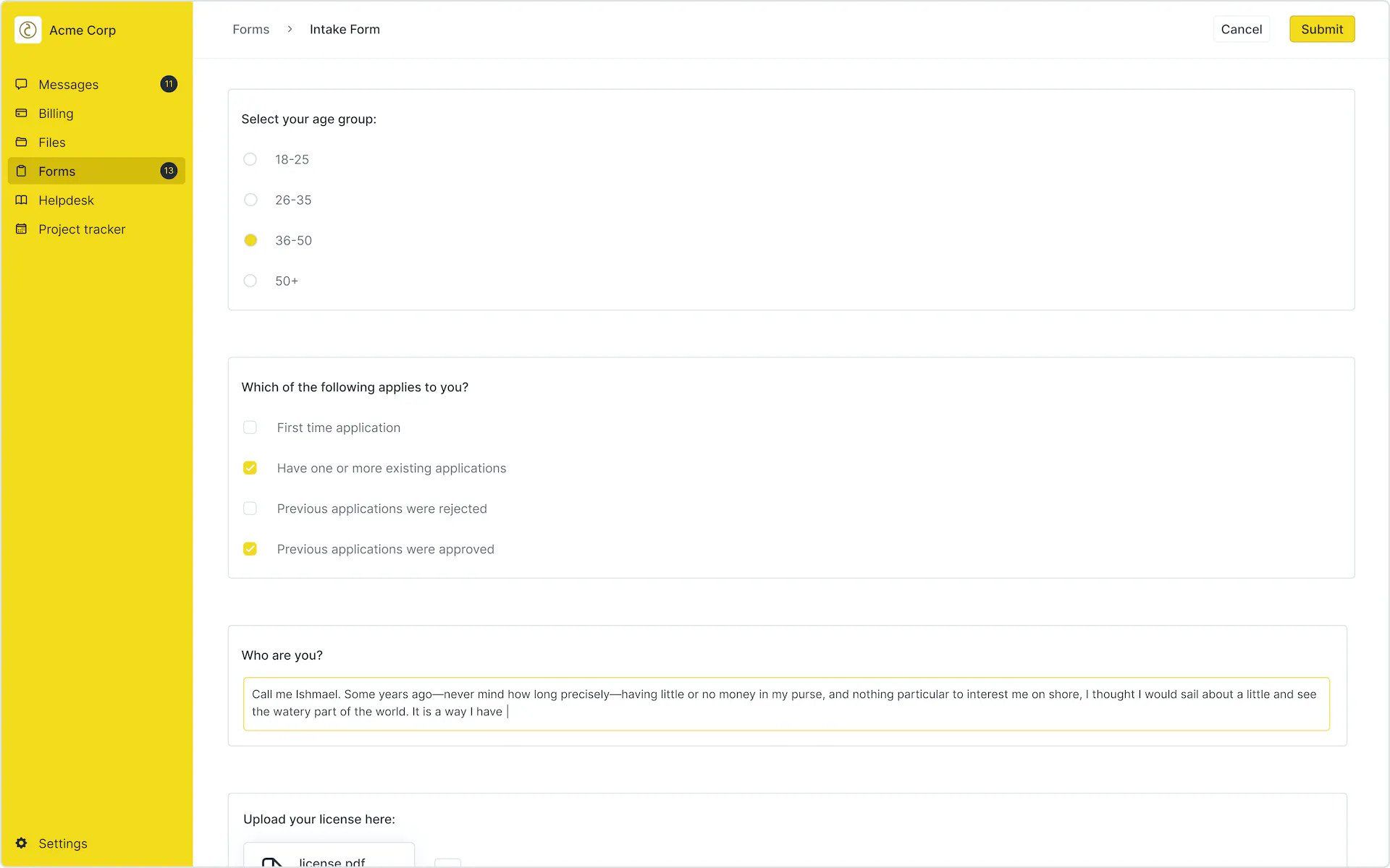 When creating a client intake form, the hardest part is determining what questions to ask. Although the form content depends on your business type — medical practitioners, for example, will collect very different and specific information — here are core question themes to think about that apply to a majority of service-based projects.