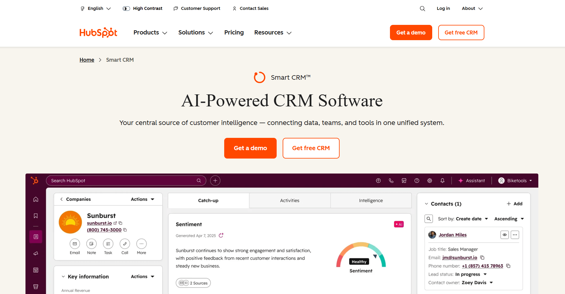 - What it does: HubSpot Smart CRM is an AI-powered customer system that brings together your customer data, teams, and tools for sales, marketing, service, and more. It’s the core layer that supports features like pipelines, dashboards, and integrations across all of HubSpot, instead of being limited to just those tools.