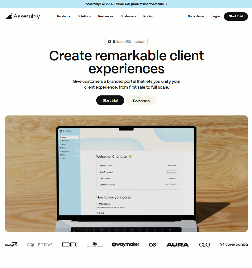 Assembly starts at $39 per month, with higher tiers offering additional client seats, integrations, and white-label customization.