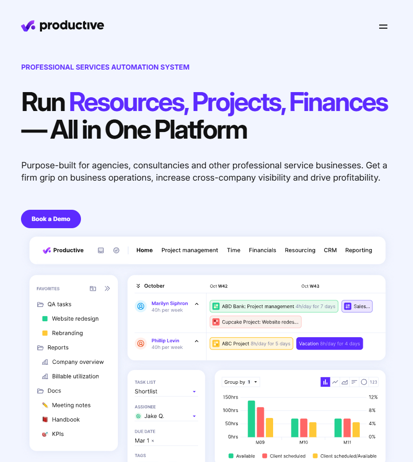 Productive stands out for how well it connects project work with financial performance. Everything from billable hours to margins updates in real time, giving consulting teams clear visibility into profitability as projects move forward.