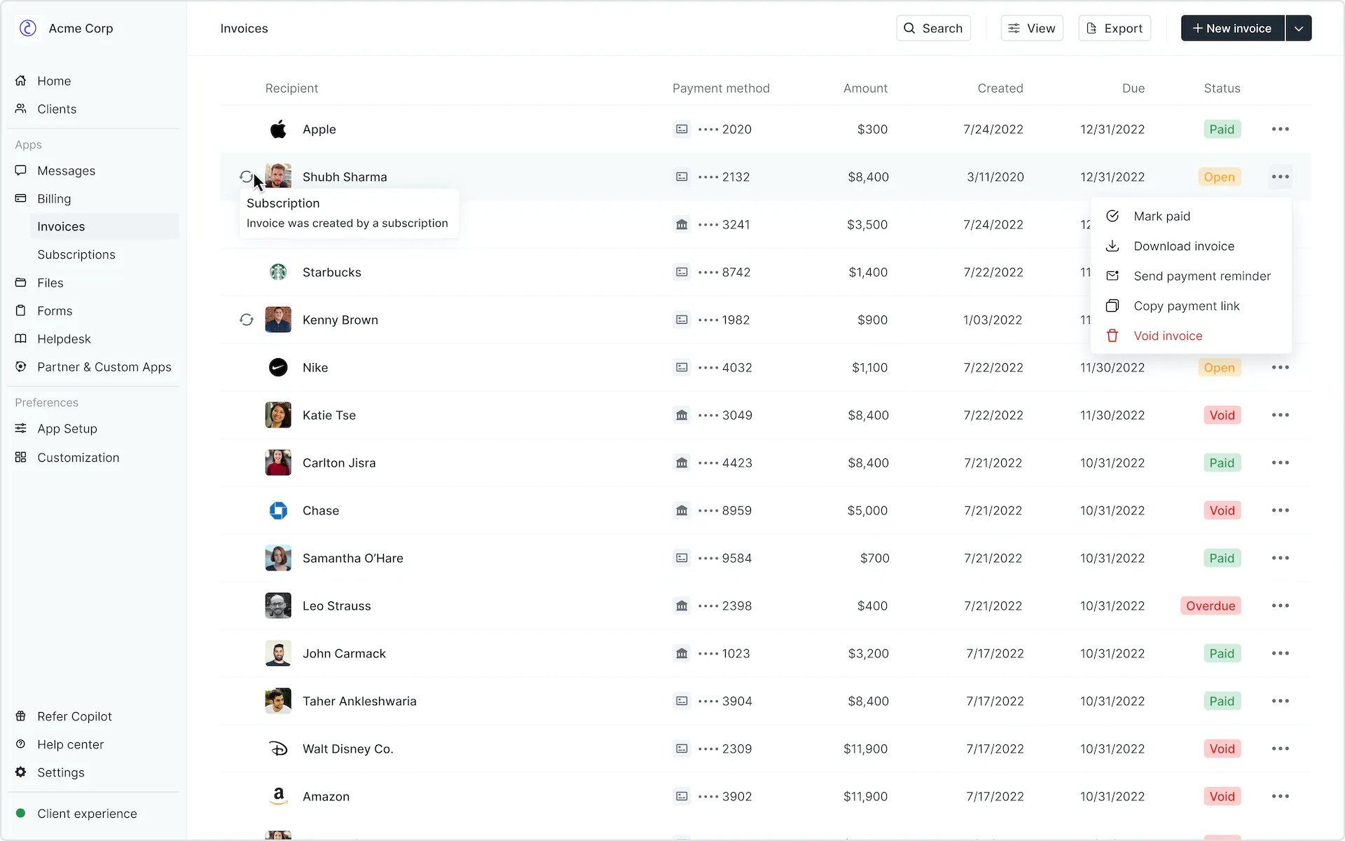 We’ve talked about why it is so important to accept all popular payment methods. Assembly can provide multiple options due to Stripe serving as our payment gateway. In other words, Stripe infrastructure sits at our foundation enabling support for the various payment methods. We’ve built features on top of this so that we can give you and your clients a more comprehensive white-label invoicing and subscription solution. Assembly offers several different components to make things easier for you and your clients.