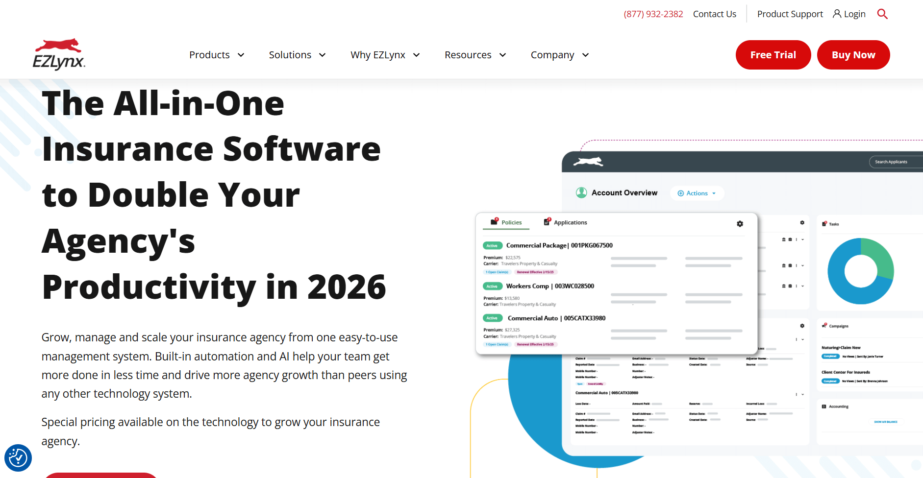 - What it does: EZLynx is an insurance agency management system built around a comparative rating engine. It lets agents enter applicant data once and pull real-time personal lines quotes from over 330 carriers across 48 states. It also has separate commercial lines submission tools available within the broader platform.