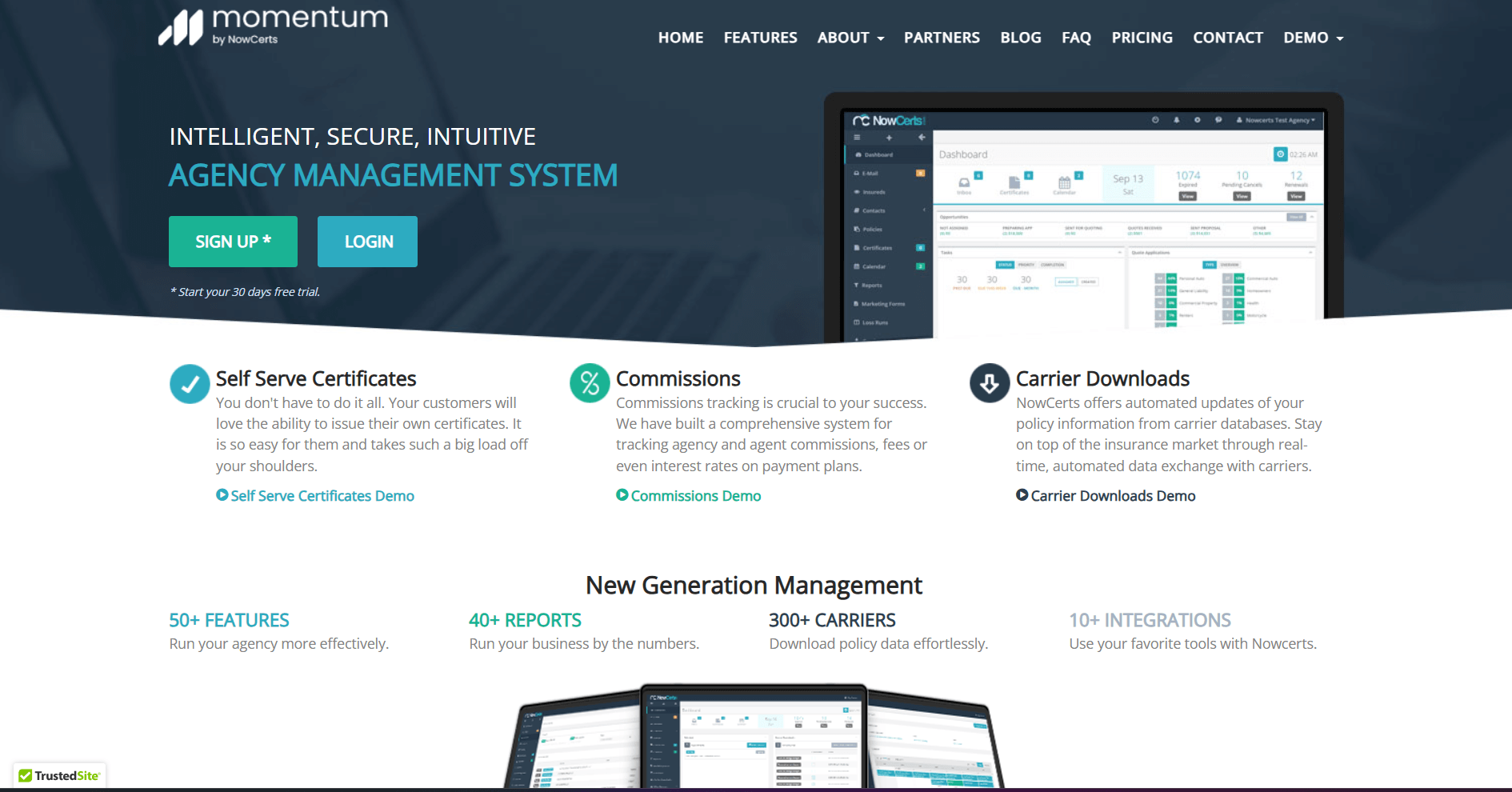 - What it does: Momentum (by NowCerts) is a cloud-based agency management system. It handles policy management, document storage, ACORD forms, commission tracking, and reporting in one platform. It also connects with personal and commercial lines raters, CRMs like AgencyZoom, and payment processors like ePayPolicy through an open API.