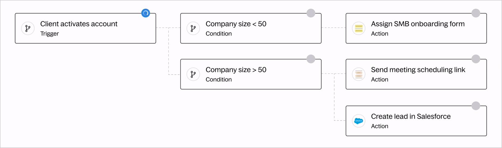 One of the most time-intensive processes for businesses is onboarding new clients. A typical onboarding process involves sending clients a series of email notifications from different products to set up external accounts, submit forms, sign contracts, upload files, and more. Assembly Automations streamlines this entire process by letting you create a customized step-by-step onboarding experience that lets you impress your clients right at the start of the relationship. For example, you can now automatically greet clients with welcome messages, assign them an onboarding form, update client properties based on those form responses, and upload default files and folders.