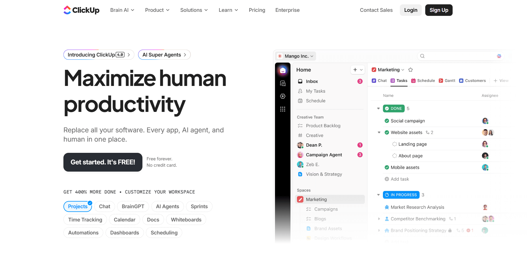 - What it does: ClickUp brings tasks, documents, goals, and dashboards into one workspace. You can build detailed task structures, assign work, and switch between views like list, board, or calendar.