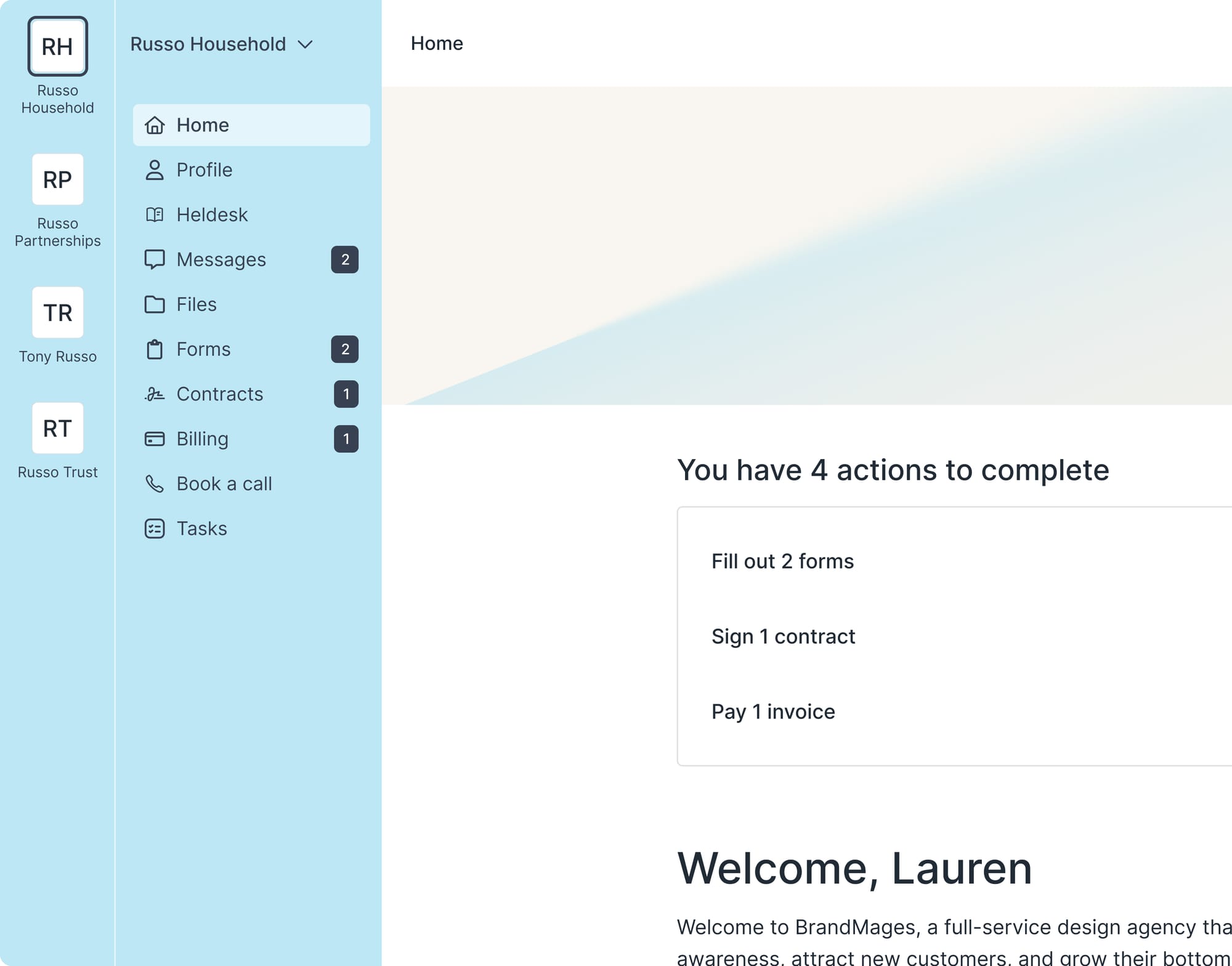 Your clients assigned to multiple companies now see a new primary sidebar that lets them switch between companies with only one login. This sidebar also surfaces cross-company notifications, so clients know when they need to switch companies to take actions.