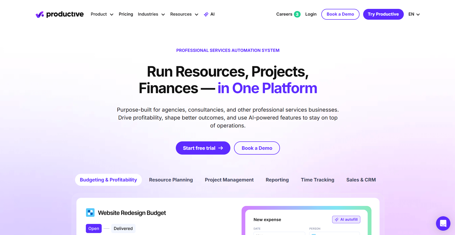 | Productive | Agencies requiring deep financial visibility | $10/user/mo(min 3 users) | Budgeting, forecasting, profitability reporting, and project planning. |