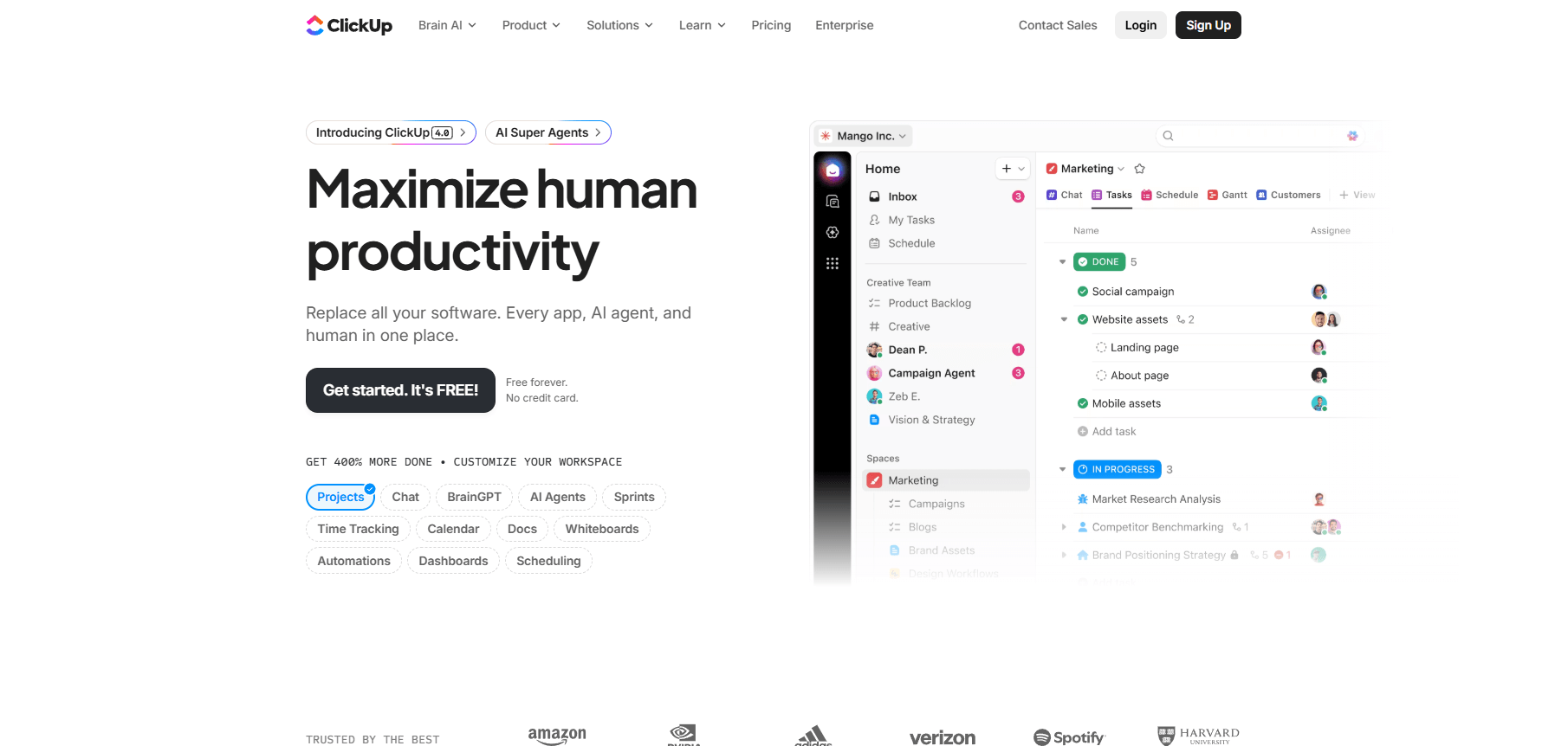 - What it does: ClickUp brings tasks, documents, goals, and dashboards into one workspace. You can build detailed task structures, assign work across consulting phases, and switch between views like list, board, timeline, or Gantt to match different workflow stages.