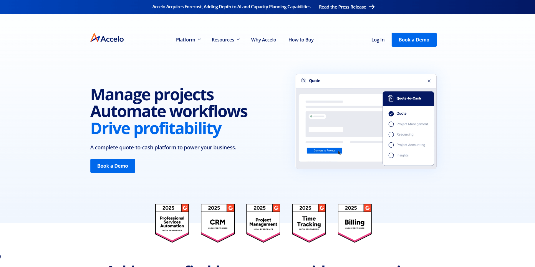 - What it does: Accelo connects client relationship management, project delivery, and invoicing in one platform. You can track leads, convert them to projects, manage consulting work, log time, and bill clients without switching systems.