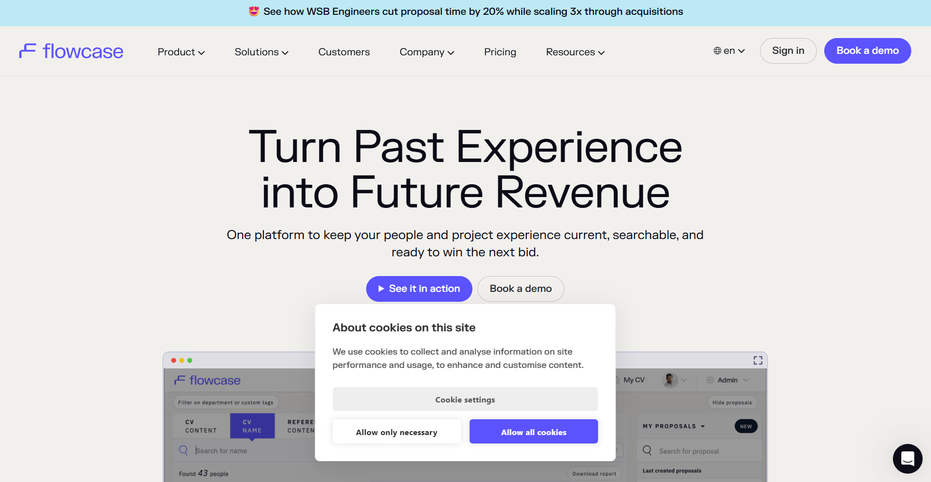 Flowcase is a tool designed to help professional services firms manage and tailor resumes (CVs) and case studies for bids and proposals. By centralizing employee and project information, Flowcase allows teams to find the right expertise and customize content to meet client requirements and improve proposal quality.