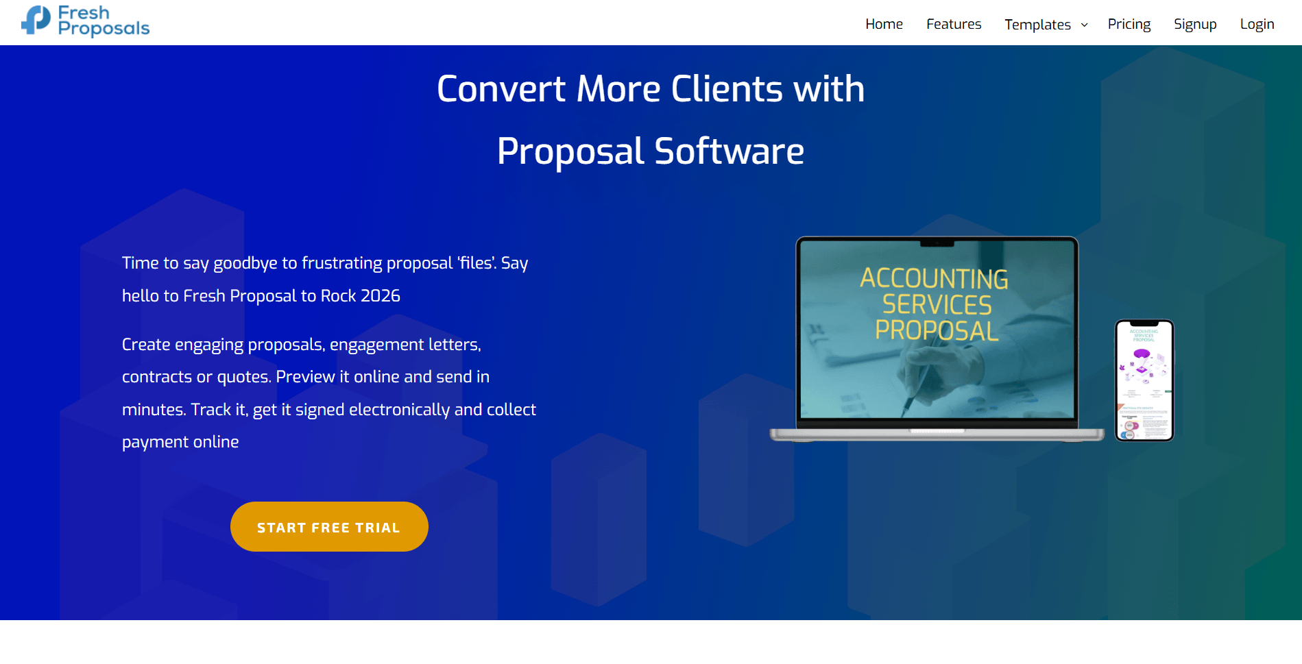 Fresh Proposals is an online proposal and quote management tool that lets sales teams build amazing proposals with interactive quotes and eSignatures to wow prospects. By combining proposal creation, tracking, and client engagement into one platform, Fresh Proposals speeds up the sales process so you can close deals faster and more efficiently.