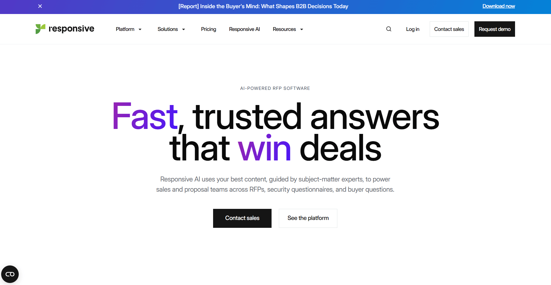 Responsive (formerly RFPIO) is a Strategic Response Management (SRM) platform that uses AI to help bid and response teams deliver smarter, faster responses to RFPs, RFIs, DDQs, and more. By centralizing content and automating workflows, Responsive helps you surface the best answers and win more.