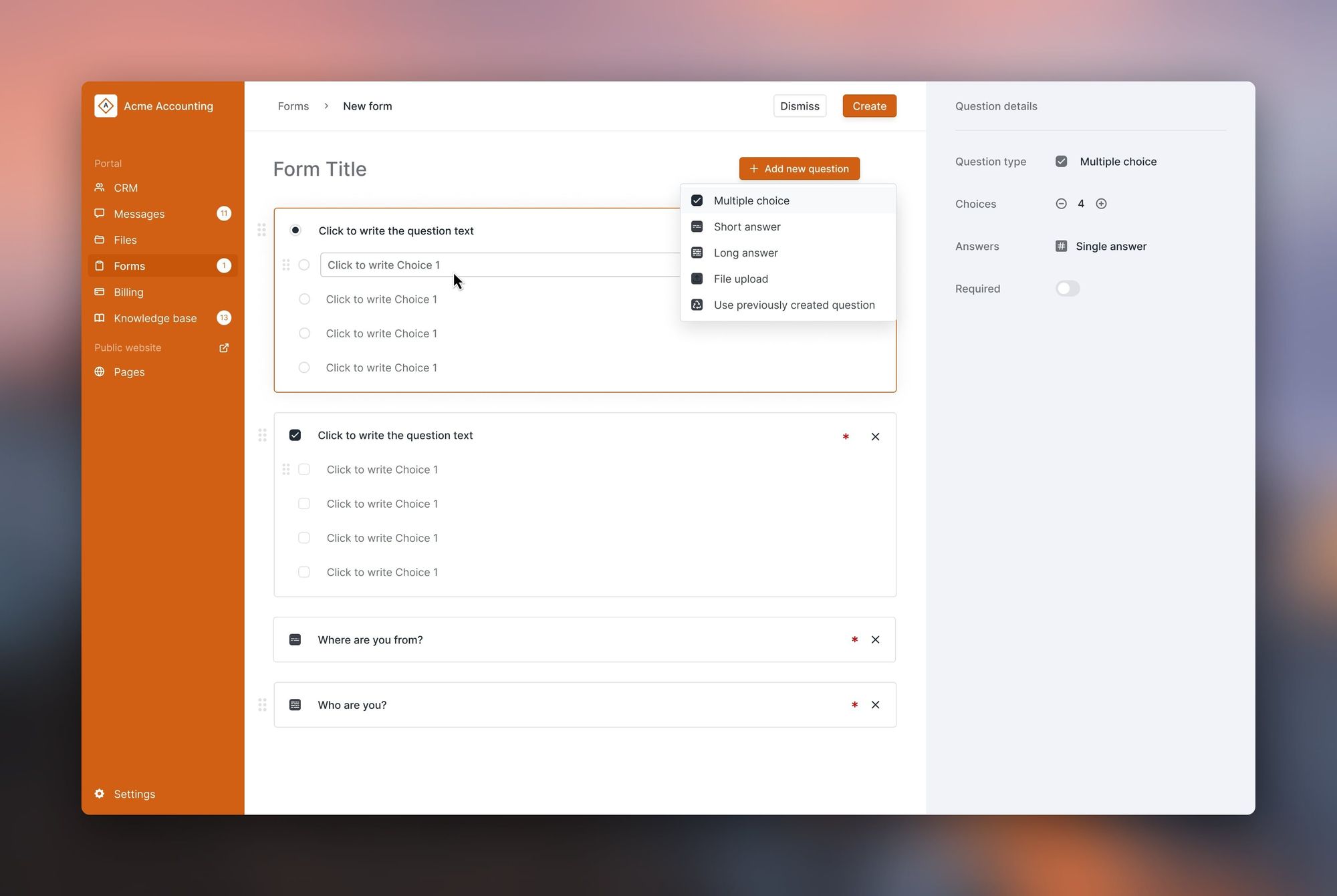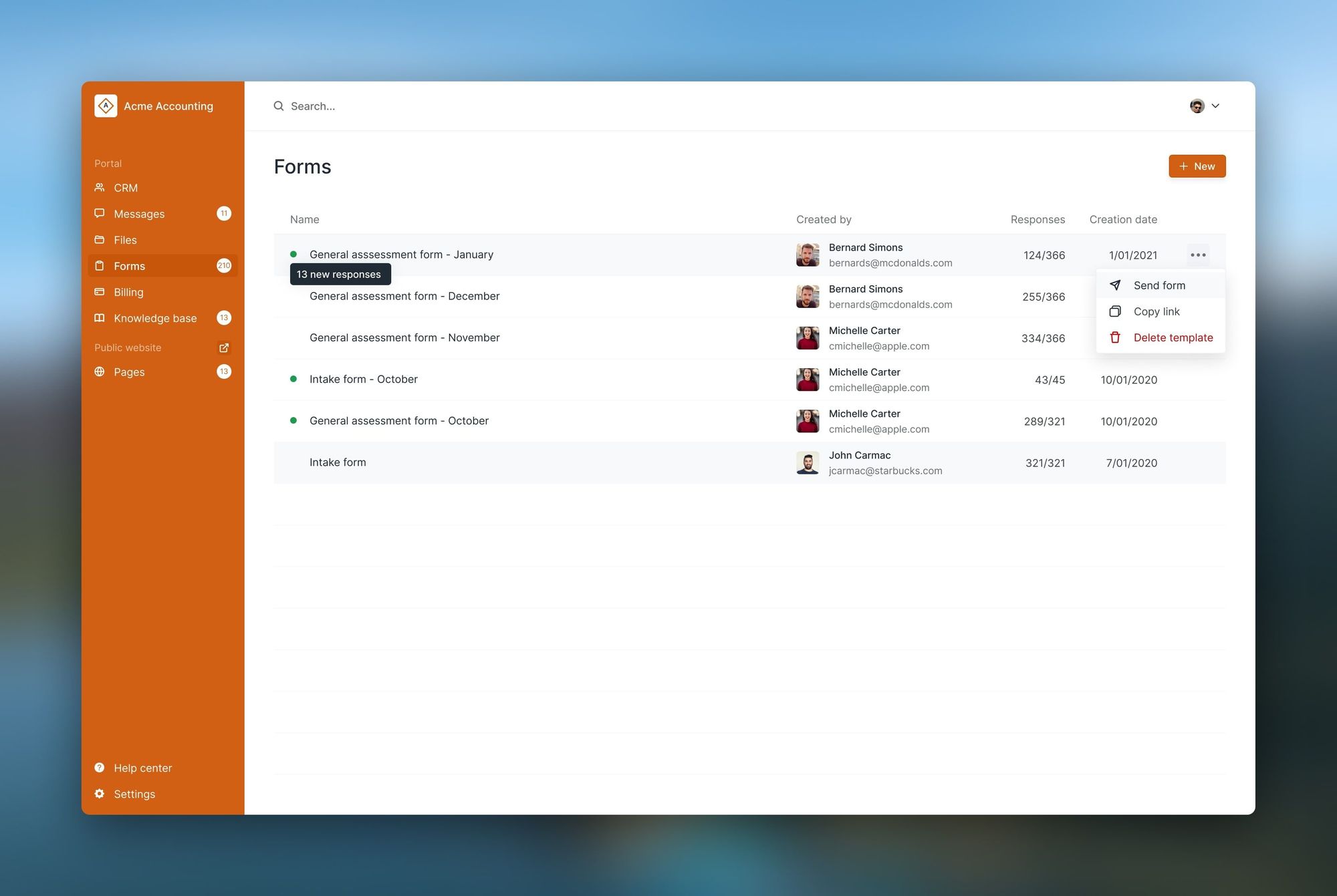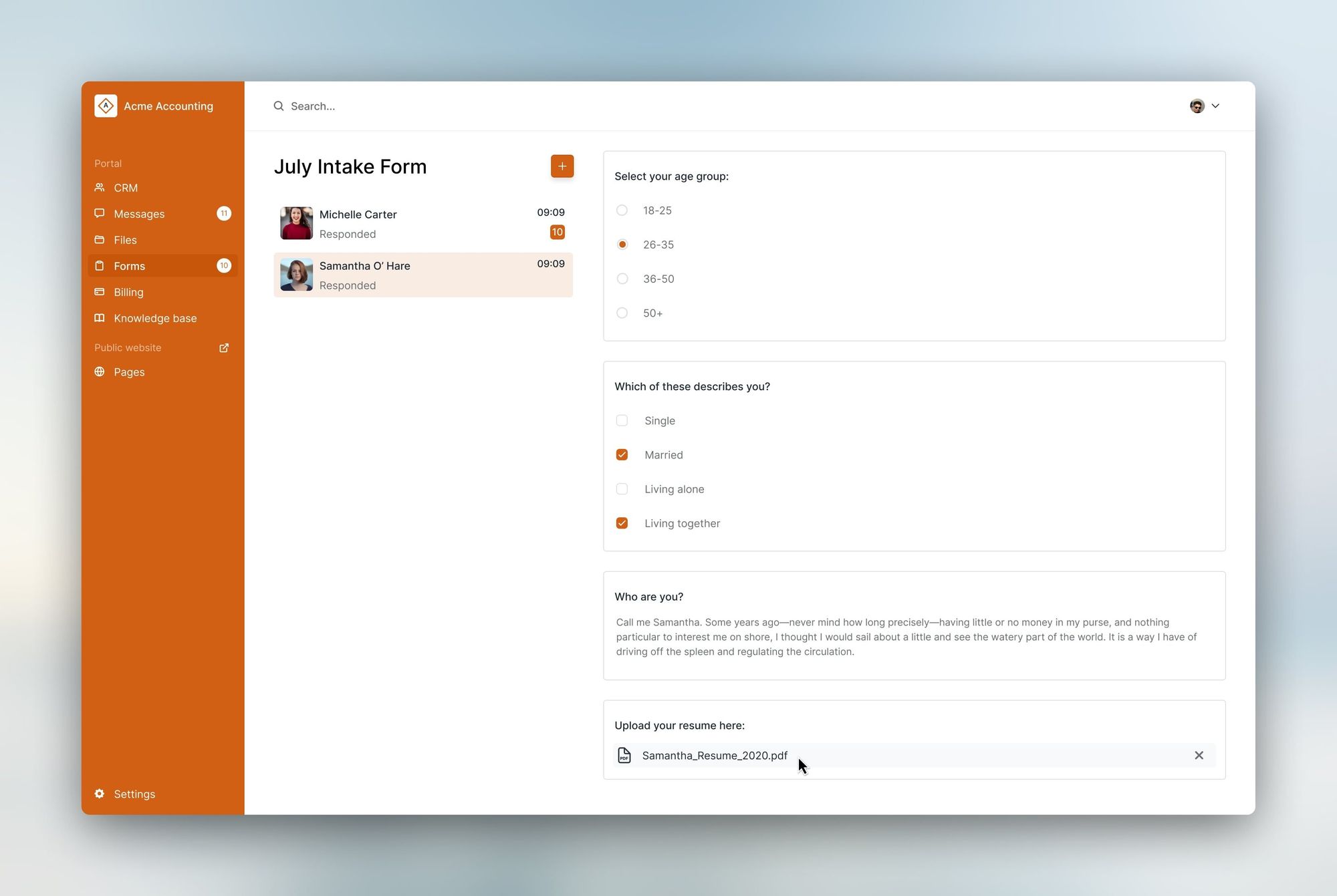 With client intake forms, collecting information from clients becomes quick and streamlined. With this release, we support multiple choice questions, short answer questions, long answer questions, and file uploads. Watch the video to see how it all comes together.