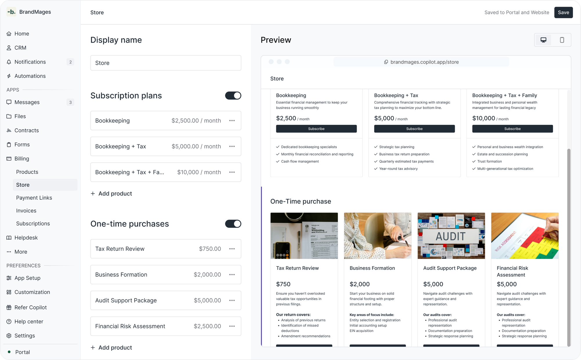 Assembly Store was specifically designed for professional service firms where the client experience doesn’t stop at the checkout page. Post-purchase, clients are taken to your client portal so they can immediately start working with you.