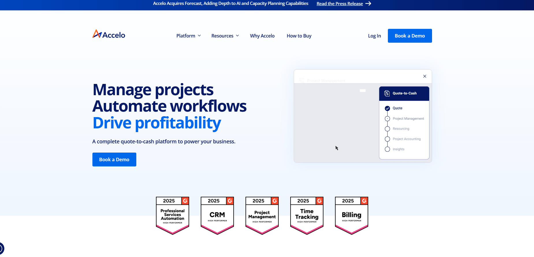 | Accelo | Custom pricing | Professional services firms tracking profitability | Quote-to-cash workflow connects sales, delivery, and billing in one system |