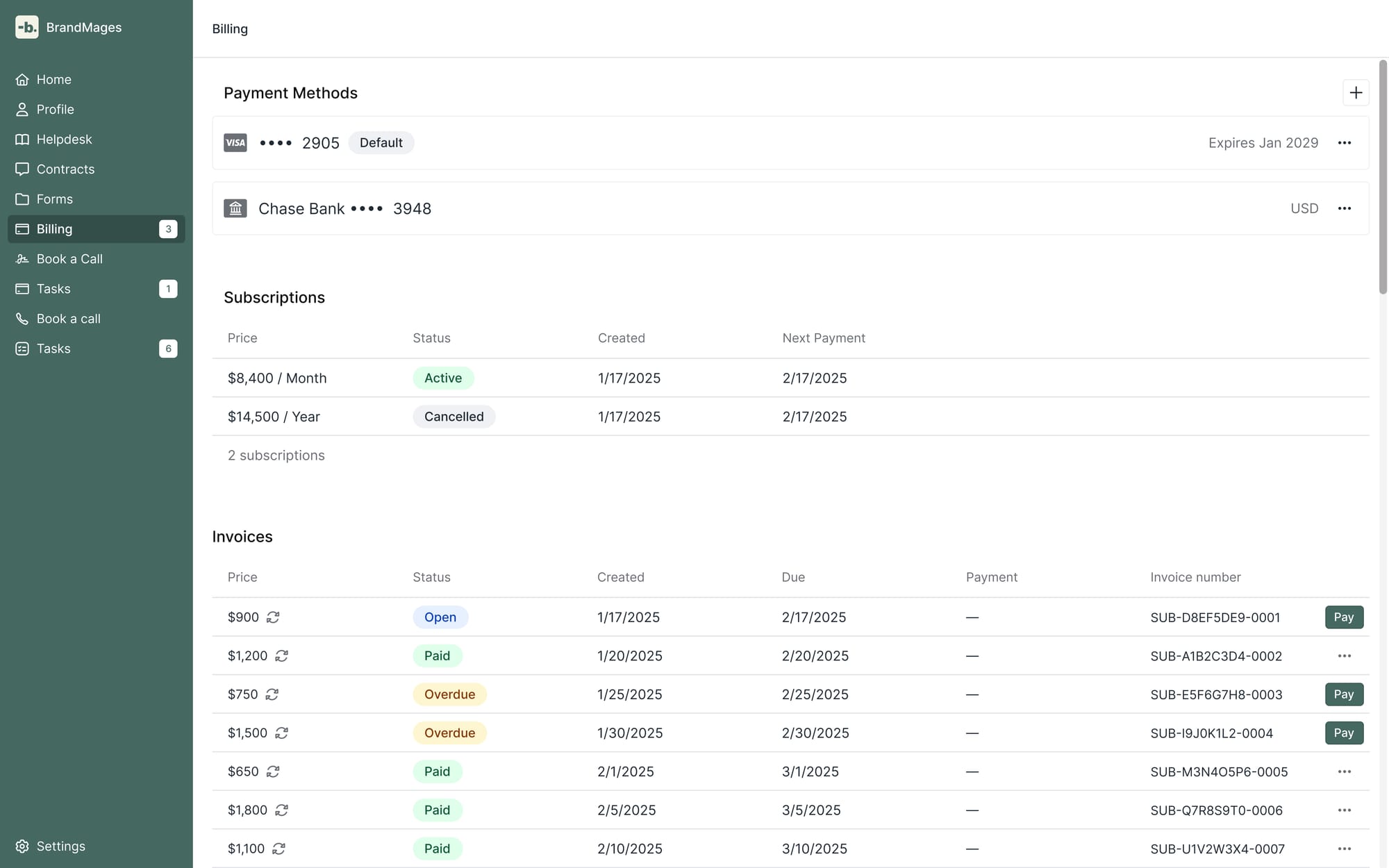 Your clients now have a redesigned Billing page that brings together everything related to payments. They can easily add and manage payment methods, view active subscriptions, and see and pay invoices — all in one place.