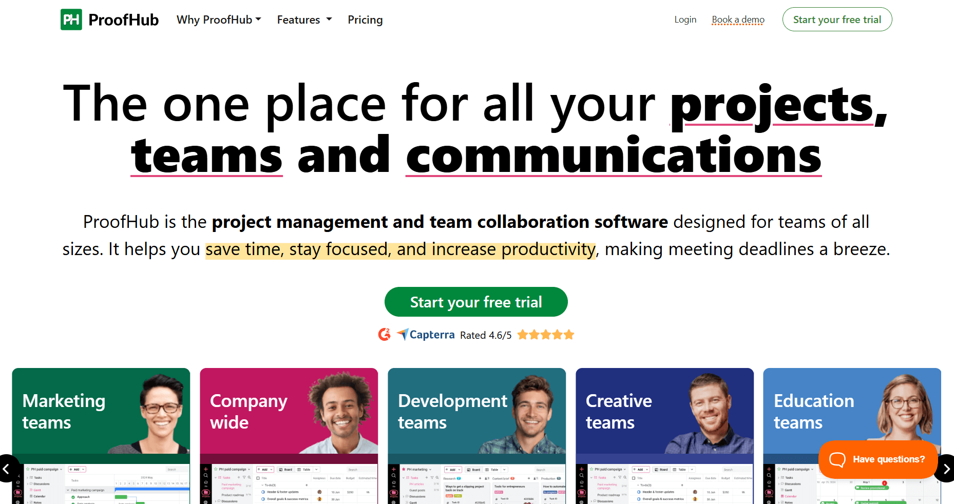 - What it does: ProofHub is a project management and team collaboration platform that charges a flat monthly rate instead of per-user pricing. It includes task management, proofing tools, time tracking, and team chat.