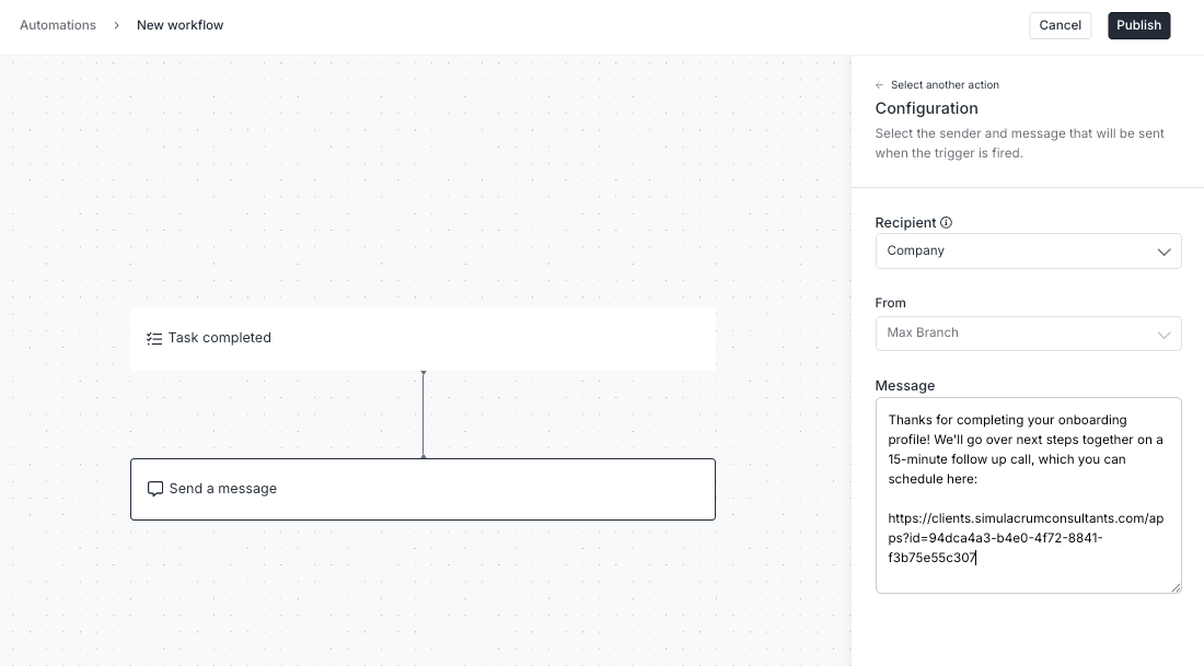 - When a client completes a task to “Fill out onboarding profile” → send the client a message sharing next steps.